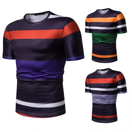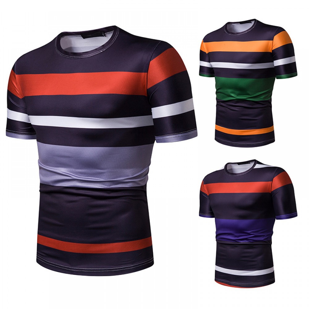 New Summer Men's Short-Sleeved T-Shirt Mens Contrast Striped Slim-Fit Casual T-Shirt
